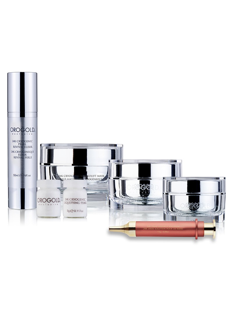 The Exclusive OROGOLD 24K CryogeniC Pearl Revival Elixir rejuvenates dull, dry skin and reduces the appearance of fine lines and wrinkles. The combination of 24K Gold and Mother of Pearl helps maintain a youthful appearance.
